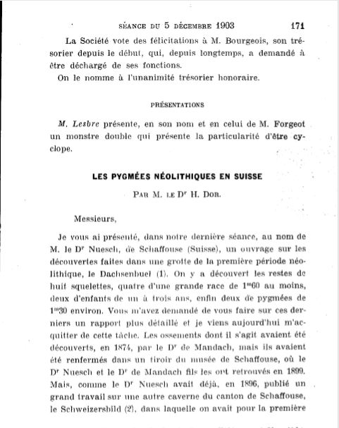 Sa communication était passée inaperçue quand, en 1894, les fouilles des sépultures de l’époque néolithique, faites sous la direction de Jakob Nüesch, au voisinage de Schaffouse, mirent à jour au milieu de squelettes de grande taille, cinq squelettes d’une remarquable petitesse, que Julius Kollmann montra être des adultes, concluant à l’existence indéniable de pygmées habitant en Europe lors de l’âge de pierre. Depuis lors, Jakob Nüesch et Julius Kollmann ont multiplié les travaux sur cette question, comme vous l’a montré l’intéressant rapport que vient de nous exposer Mr Dor. […] Faisant la synthèse de tous ces travaux, on arrive à cette idée qu’une race de pygmées a du peupler le monde dans les temps les plus reculés et, avec Julius Kollmann et Jakob Nüesch, on tend à les considérer comme l’avant-garde de la variété actuelle de l’espèce humaine […] En France, Lapouge a, en 1883, décrit son type Homo contractus, type comparable d’après lui, par son crâne et sa taille, aux groupes des Akkols, Andamans et autres pygmées, découverts dans les cavernes des Cévennes et dans l’Hérault.