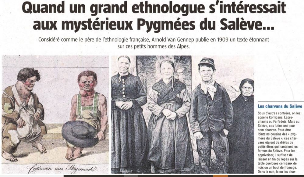 Dès 1909, galvanisé par les fouilles archéologiques de Julius Kollman et Jakob Nüesch, le grand folkloriste Arnold Van Gennep s’intéresse lui aussi à ce curieux « petit peuple » alpin, en récoltant toute une moisson de témoignages dans la vallée du l’Arve et du Salève (Haute-Savoie). Une fois encore, deux types de nains se distinguent nettement de la récolte testimoniale : « il y a crétin… et crétin ». Selon le chercheur, il ne faut pas confondre le dégénéré – bossu, tordu, goitreux, dont les infirmités ont pour cause principale le manque d’iode dans les vallées montagneuses – et l’homme de très petite taille, mais bâti et proportionné normalement.