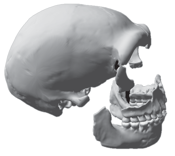 Reconstruction du crâne et de la mandibule de Spy 1 réalisée par C.Zollikoffer pour l ‘Institut royal des Sciences naturelles de Belgique.