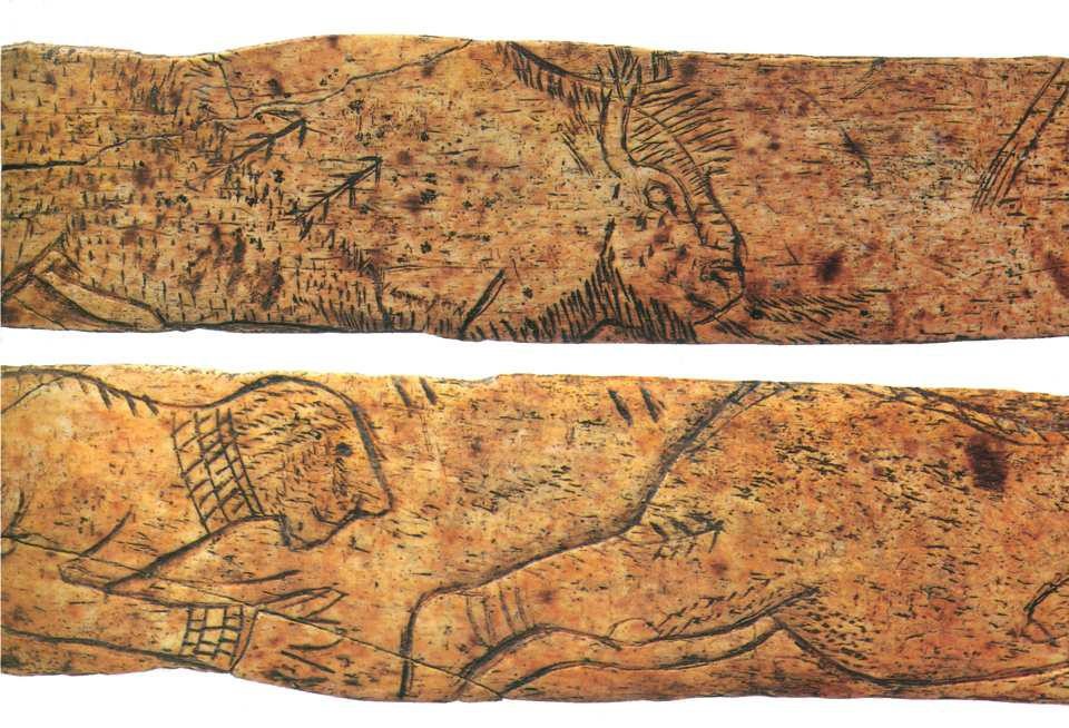 Bernard Heuvelmans évoquait déjà, dans « L’homme congelé du Minnesota », la présence d’une lame osseuse dans la grotte d’Isturitz datant de la période magdalénienne. Les archives scientifiques nous permettent de remonter à la communication du docteur René de Saint-Périer sur la question : « […] Sur la face opposée, deux figures humaines se font suite. A la partie supérieure, est gravée une femme nue aux formes massives. La tête manque, à cause de l’état incomplet de la lame osseuse ; il semble qu’un collier ait orné le cou. […] Au-dessous de la femme, une figure d’homme, à face barbue plutôt que masquée, est représentée seulement à mi-corps, à cause de la fracture ancienne de la pièce […] On connait de rares figurations humaines paléolithiques accompagnées de flèches : le guerrier blessé de la Cueva Saltadora, le combat de Morella la Vella, par exemple, mais aucune œuvre d’art à cette époque, à notre connaissance, n’a montré un trait barbelé dirigé contre une femme. Il nous semble difficile de voir dans notre gravure, comme dans cette dernière scène ou comme pour les flèches frappant des animaux, une intention de meurtre. Nous y verrions plus volontiers un désir de possession.