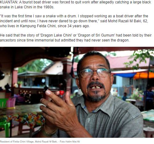 L’explorateur Stewart Wavell a visité le lac Chini dans les années 1960, et a été informé de l’ancienne pratique de sacrifice humain dédiés au culte du dragon, ayant lieu autour d’un grand pilier rocheux qui dépasse hors des eaux. Ces sacrifices étaient censés pacifier le dragon. Un de ses guides, Che Yang, lui a parlé d’une grande inondation qui avait frappé la ville de Pekan quelques années auparavant. Beaucoup de gens s’étaient demandé si c’était le dragon qui exigeait des sacrifices, même s’ils n ‘étaient plus pratiqués depuis des générations. Un jour, une fille faisant sa lessive sur le lac, est tombée de son radeau et s’est noyée. On a remarqué que les eaux se sont immédiatement reculées. Les citadins croyaient que le dragon était maintenant satisfait – après avoir pris sa victime.