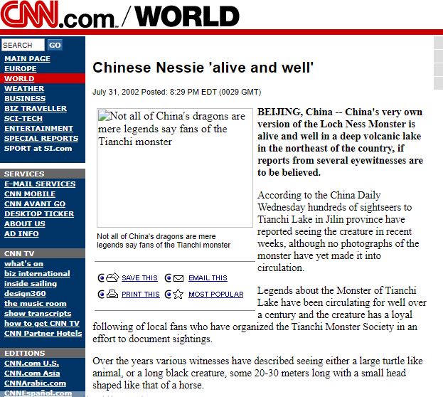 En 1944, des centaines de personnes ont vu une créature d’une douzaine de mètres de long, noire, comme un lézard, couché sur une plage de sable près du village de Chenj iaweizi, dans la province de Jilin. Il était couvert d’écailles et avait des moustaches.