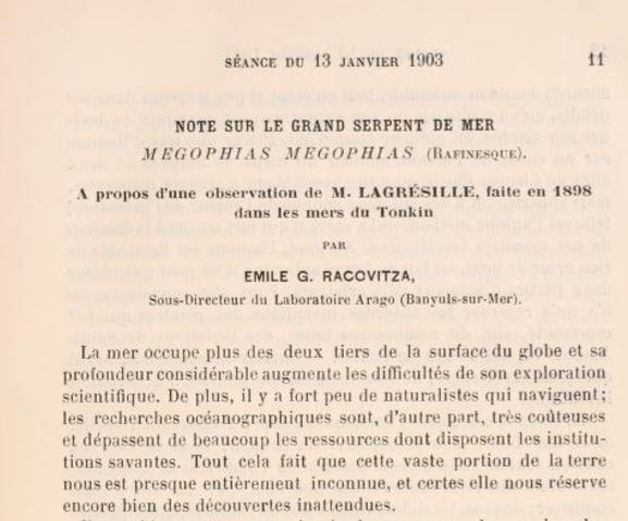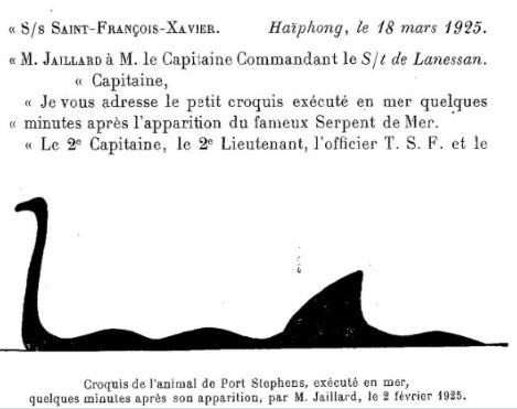 «Au mois de juillet dernier (1897), l’Avalanche apercevait pour la première fois, au large de La baie d’Along, deux animaux de forme bizarre et de grandes dimensions; leur longueur fut évaluée à environ 20 mètres, et leur diamètre de 2 à 3m. La particularité de ces animaux était que leur corps n’était pas rigide comme celui des cétacés connus, mais présentait des mouvements ondulatoires semblables à ceux d’un serpent, mais dans le sens vertical. Un canon-fut armé et un coup tiré à 600 mètres, distance légèrement trop courte. Aussitôt ils plongèrent en soufflant bruyamment et laissant à la surface un remou analogue à celui des brisants. Ils n’ont pas réapparu, on avait cru apercevoir leur tête, qui fut jugée petites dimensions.