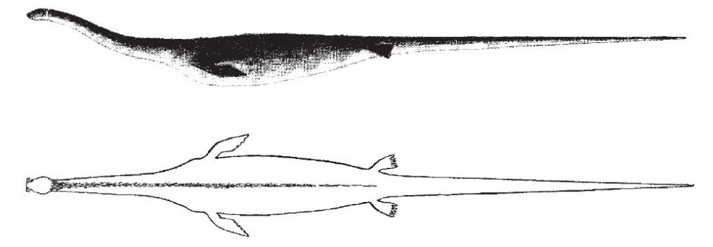 La couleur de l’animal était grise avec plusieurs nageoires noires. Il était facile de le suivre à cause de son souffle, qui a formé des cercles de 4 à 5 mètres de diamètre sur la surface de la mer, qui était alors parfaitement calme. À un moment j’ai pensé l’avoir atteint. La poursuite a continué pendant une heure et demie et a dû être abandonné car la nuit tombait