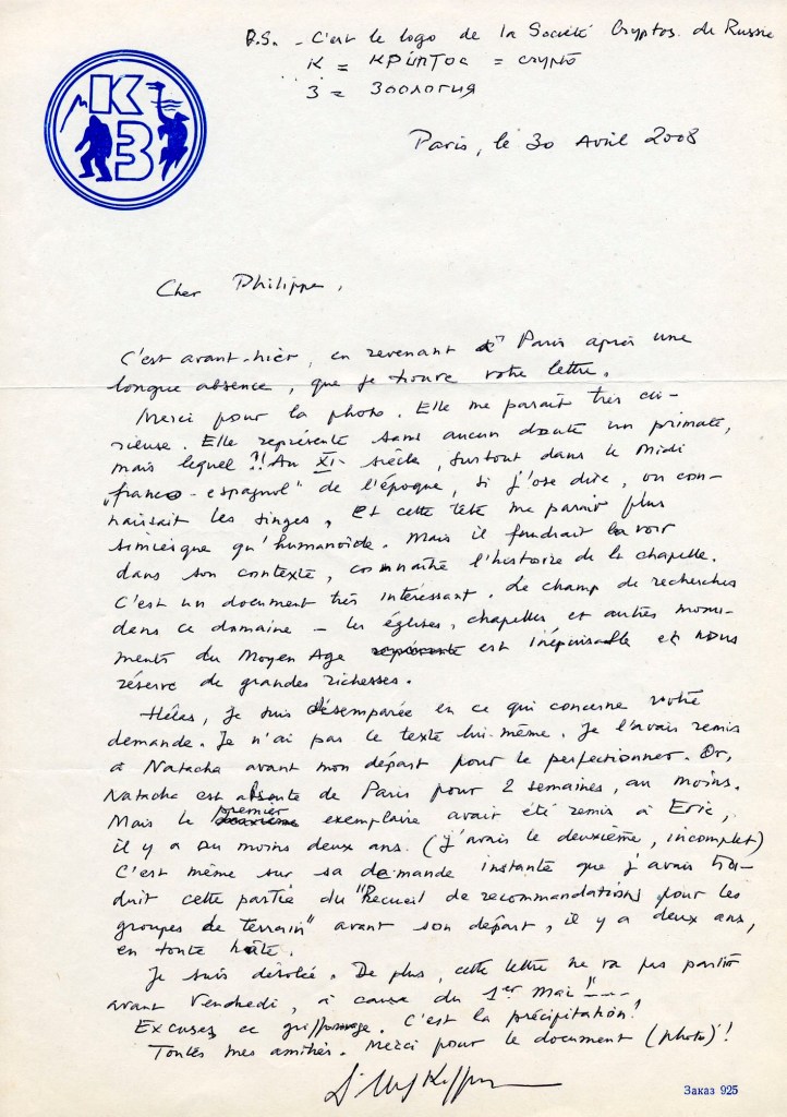C’est avant-hier, en revenant à Paris après une longue absence, que je trouve votre lettre. Merci pour la photo. Elle me paraît très curieuse. Elle représente sans aucun doute un primate, mais lequel ? Au XI° siècle, surtout dans le midi « franco-espagnol » de l’époque, si j’ose dire, on connaissait les singes. Et cette tête me parait plus simiesque qu’humanoïde. Mais il faudrait la voir dans son contexte, connaître l’histoire de la chapelle. C’est un document très intéressant. Le champ de recherche dans ce domaine (les églises, chapelles et autres monuments du Moyen-âge) est inépuisable et nous réserve de grandes richesses.