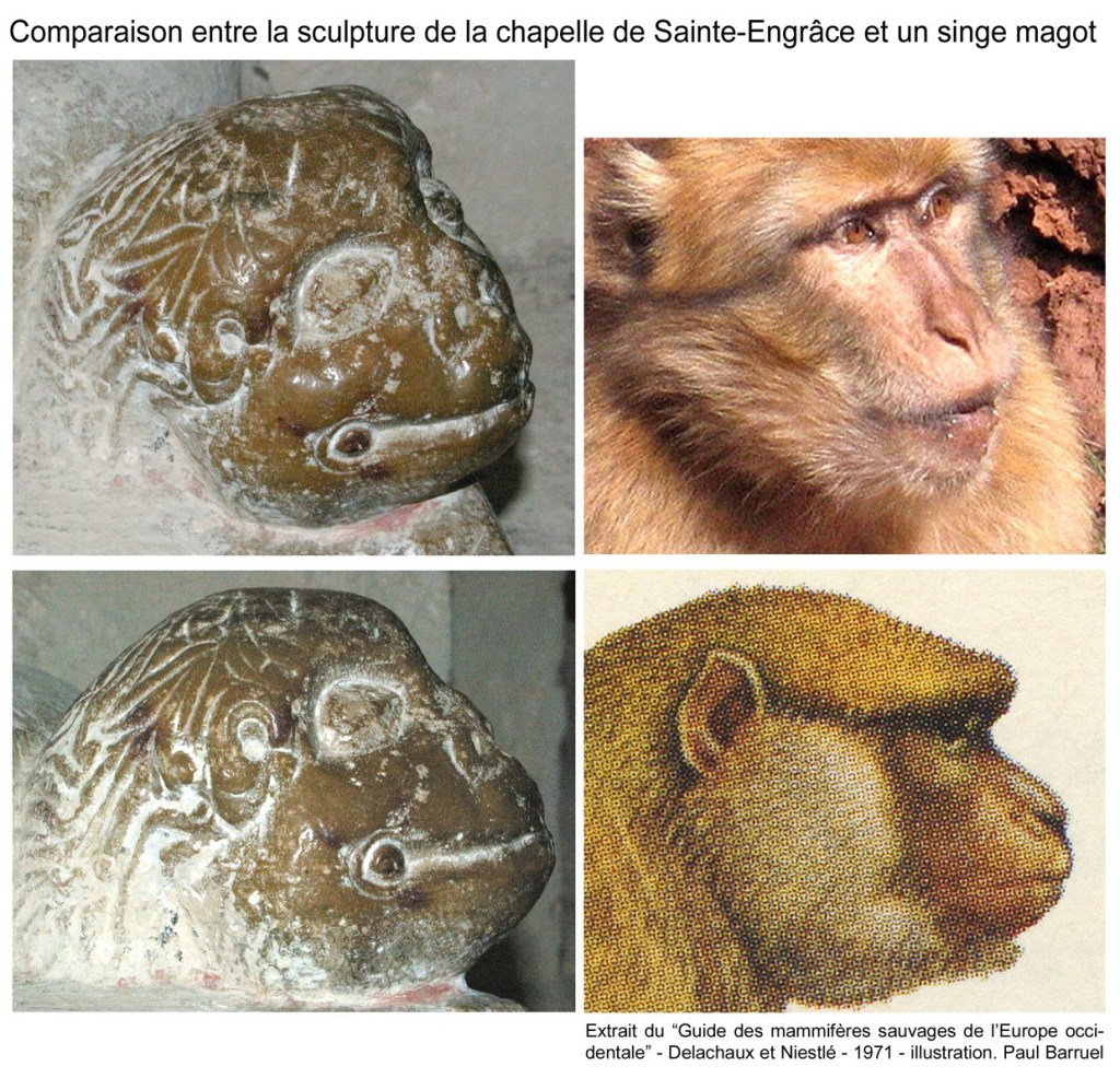 Cette réponse de Marie-Jeanne Koffmann à l’envoi d’une série photographique du bas-relief nous a été fort précieuse. En effet, elle a mis judicieusement en relief la cohabitation de l’homme médiéval à cette époque avec un petit primate de l’Afrique du Nord, le singe magot (Macaca sylvanus).  Le singe magot, venu de la lointaine Barbarie (Sud de l’Espagne, Maroc), deviendra par la suite l’animal fétiche des montreurs et troubadours à part égale avec l’ours de nos campagnes. Philippe Coudray m’a fait parvenir, par la suite, un comparatif entre le bas-relief de Saint-Engrâce et un singe magot.