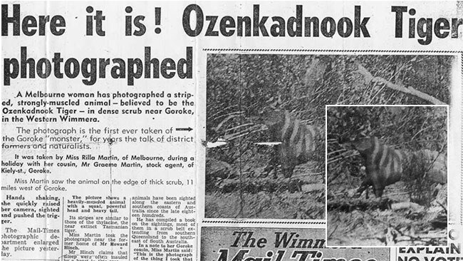 A creature that was seen around the hamlet of Ozenkadnook in southern Victoria was given the tongue twisting name of the Ozenkadnook tiger by the media. Farmer Cyril Tucker tracked one in 1962 and came within sixty feet of it. He said it was larger than an Alsatian dog with a low- slung body, a long, thick tail and a kangaroo like head. It was grey with black stripes on the rump. It ran off with a strange loping gait, the hind legs moving together.