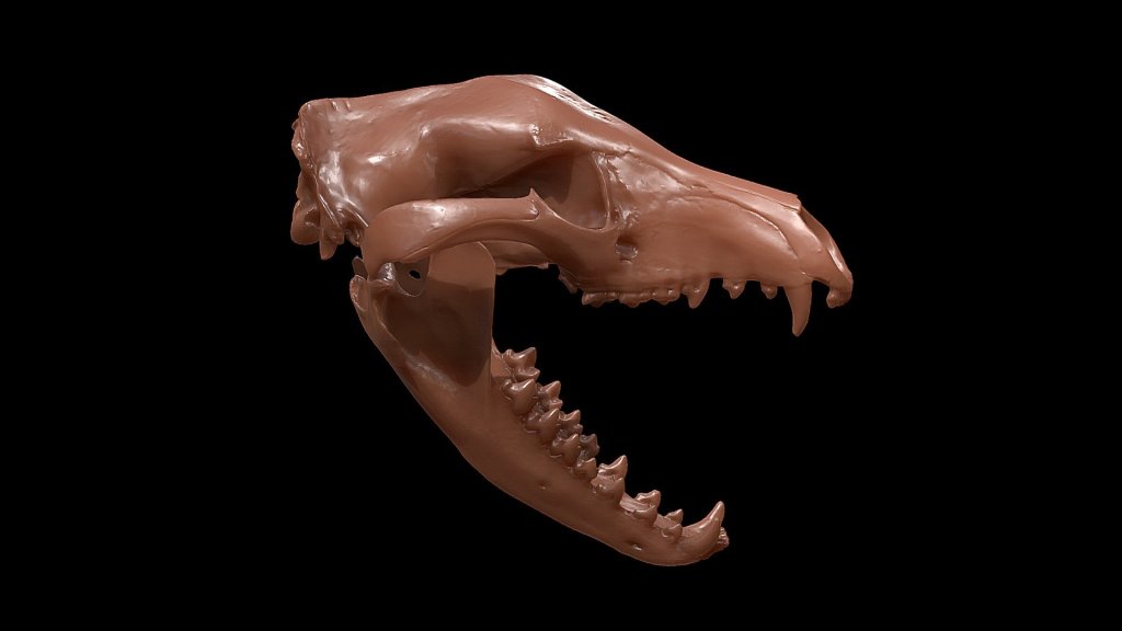 Both sexes have a backwards facing pouch. In females it is used to nurture and protect developing young and in males to protect the sex organs as it runs through vegetation after prey. The skull of the animal has a gape far wider than that of a wolf or dog. The thylacine’s dental formula are different to a wolf’s. It bore four incisors and four molars in each quadrant of the jaw as opposed to only three of each in true canids. The thylacine has a more powerful bite than a wolf but the skull was less adapted to holding struggling prey. This suggests a different hunting strategy. Wheras pack-hunting wolves would use number to pull down prey and worry it to death, thlacyines may kill small prey animals with one bite and with larger victims inflict a bite then let them bleed to death. It is not as well adapted to fast running as a wolf but seems to have more stamina for pursuit over long distances.