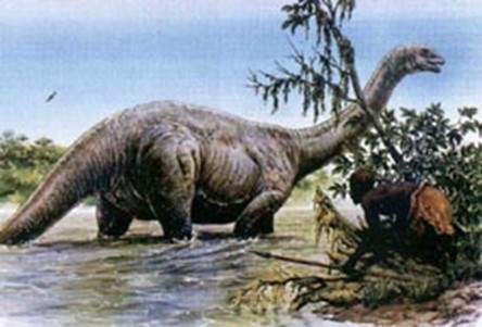 Les dinosaures vivaient alors dans des marais, au milieu de prêles, de cycas et de fougères arborescentes. Au Trias (vers 190 millions d’années), le prosauropode « Massospondylus » était très commun dans ce qui allait devenir l’Afrique ; il avait une petite tête, un cou mince et flexible, mesurait 4 à 5 m de long, marchait habituellement à 4 pattes, mais pouvait aussi se dresser sur ses membres postérieurs pour atteindre la végétation en hauteur (un comportement qu’aurait aussi, selon certains témoignages, le mokélé-mbembé).