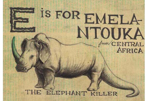 On en revient aussi à l’animal mythique « composite ». En dehors du mokélé-mbembé à l’aspect de brontosaure, certains récits évoquent aussi l’emela n’touka (en lingala, » tueur d’éléphants « ), plus agressif, avec une corne dont il se servirait pour empaler les éléphants… On connaît des statuettes de cet animal qui réunit les traits de l’éléphant, du rhinocéros, de l’hippopotame et du crocodile.