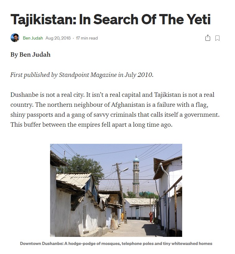 Whilst researching online for the most recent sightings I had stumbled across an article entitled Tajikistan: Search for the Yet,i in an online magazine called Standpoint. The author was a journalist called Ben Judah who had written the piece back in 2010. In it he recounts visiting the Romit Valley and meeting with witnesses, people who claimed to have seen and even been attacked by, hairy, man-like beasts whom they feared more than the mujahdeen. His guide was chased by a female hominin ten years previously whilst he was searching for firewood in the mountains. He described a black- haired creature with dangling breasts. Travelling further he talked to more witnesses. Another man attacked by a black- haired female creature and another who had a man-like beast attack his donkey. Another witness, a youth of fifteen saw the creature, hairy and monkey- like, climbing over rocks just four days before. There are no monkeys in Tajikistan. The author could not decide if this was a living myth or a living creature. I decided to contact him.