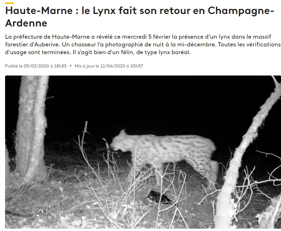 Le Lynx Boréal, (Lynx Lynx), était le plus imposant félin, et un des plus gros prédateurs de notre pays, se nourrissant de chevreuils sa proie favorite. Mais il fut -officiellement- complétement exterminé en France au 19ème siècle, ne subsistant qu’en Suisse. Dans les années 1980-90 une quinzaine de programmes de réintroduction ont eu lieu en Europe, uniquement autour des Alpes et du Jura ( en 1983 dans les Vosges). Mais au tout début des années 2000, de nombreux indices de sa présence ont commencé d’être relevés dans les Ardennes, une région relativement éloignée des endroits où ont eu lieu les programmes officiels de réintroduction.