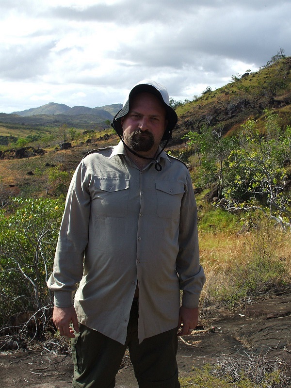 Un autre guide, un chasseur local nommé Kenard Davis nous a raconté une histoire que son père lui avait confiée. Cela s’est produit dans les années 1950. Un homme chassait et rentrait chez lui par les montagnes. Traverser directement le col de la montagne était plus rapide que de marcher tout autour. Il tenait deux oiseaux sauvages qu’il avait tués, un dans chacun d’eux. Alors qu’il s’approchait du sommet de la montagne, il leva les yeux et vit un énorme homme velu endormi dans les arbres. Il semblait utiliser les vignes comme un hamac. L’homme était si effrayé qu’il a couru jusqu’au pied des montagnes en serrant toujours les oiseaux. De retour dans son village, il est tombé malade et a cru que le di-di lui avait jeté un sort. Il consulta un chaman qui, une fois en transe, pu contacter le di-di. Le chaman lui a dit que l’homme mourrait de peur. Les di-di vivaient sur la montagne, ils avaient une famillequi vivait dans les montagnes voisines. Ils n’ont jamais fait de mal aux gens. Kenard n’avait jamais vu de di-di lui-même mais il nous a parlé d’une étrange créature qu’il avait rencontrée. Jusque dans les années 1970, un petit pygmée à face rouge était bien connu dans la région. Il était sans poils, nu, à la peau brune et mesurait environ 3 à 3,5 pieds. Il avait un visage peint en rouge et arborait toujours un sourire étrange. Il sautait hors des buissons en souriant aux passants et leur faisait peur, bien qu’il n’ait jamais fait de mal à personne. L’oncle de Kenard avait une moto et le petit homme au visage rouge sautait souvent à l’arrière et se laissait promener. Il descendait toujours au même endroit, là où l’oncle de Kennard pensait être sa maison. Selon Damon, les gens lui ont laissé des cadeaux, comme du tabac.