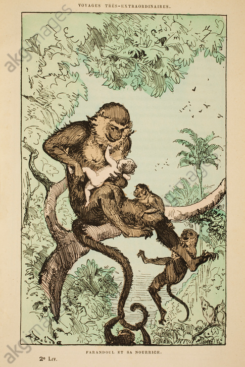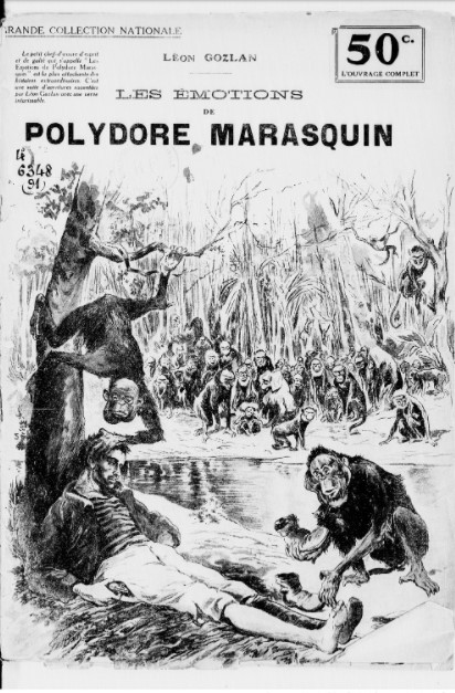 Par exemple Polydore Maresquin, ou le royaume des singes de Léon Gozlan, publié par épisodes en 1856. Au cours d’un naufrage, des animaux capturés par un chasseur professionnel cruel se retrouvent sur un île déserte, en compagnie du dit chasseur lui aussi rescapé. Ce dernier, malgré l’amitié développée avec un petit chimpanzé, est battu et maltraité par les autres singes pendant trois mois.