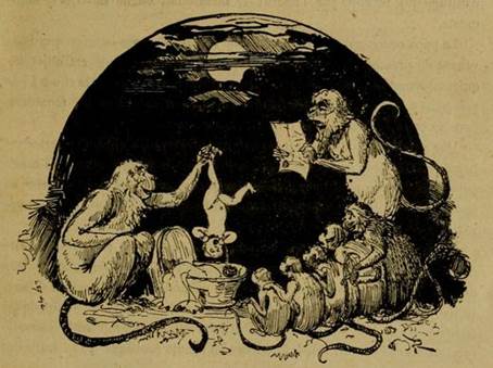 La pauvre femme se trouvant elle même seule oubliée et abandonnée, sans aucun espoir de vie, commença à pleurer pitoyablement et à se lamenter, en se recommandant à Dieu, pour qu’il lui porte secours dans cet état lamentable et solitaire. Alors qu’elles faisait ces tristes plaintes, il descendit de la montagne un grand nombre de grands singes, qui à sa terreur extrême et à son étonnement, l’entourèrent, parmi lesquels se trouvait un de loin plus grand que le reste, qui se tenant debout sur ses jambes de derrière, sembla d’une hauteur en rien inférieure au type commun des hommes: Voyant la femme pleurer si amèrement, comme une qui se tenait assurément pour morte, il s’approcha d’elle, en montrant une apparence enjouée, et d’une façon flatteuse au moment ou il l’invita à le suivre dans les montagnes, sur quoi elle accepta de bonne grâce.
