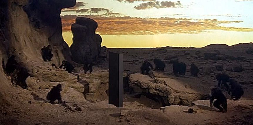 L’adaptation cinématographique de La Planète des singes en 1968 est suivie, à quelques semaines près, de la sortie du chef-d’œuvre de Stanley Kubrick 2001,l’Odyssée de l’espace, qui revisite la théorie de l’évolution et le postulat de la sélection naturelle : dans la première séquence, « L’aube de l’humanité », des australopithèques découvrent la violence au contact d’un monolithe extraterrestre…