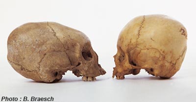 Exemple de déformations rituelles : brachycéphale (à droite) et dolichocéphale (à gauche).