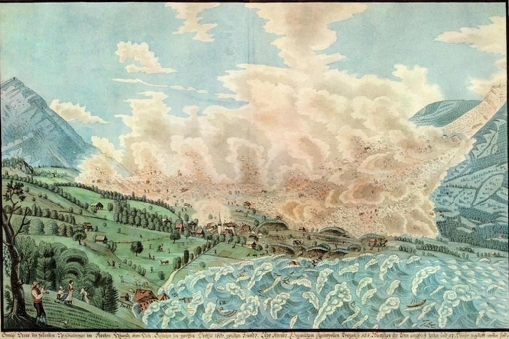 Une catastrophe naturelle frappa bien la région au tout début du moyen-âge, c’est attesté, par les chroniqueurs contemporains de l’événement, tel Grégoire de Tours, ou l ‘évêque d’Avenches qui raconte ainsi: