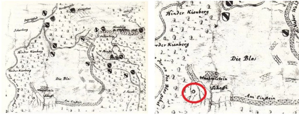 D’après l ‘auteur de l ‘article, l’anneau, et son emplacement exact, là on peut encore le trouver aujourd’hui, figurent sur la totalité des cartes anciennes de ce lieu. Pour preuve, cette carte du Mont St Odile datant de 1603. L’anneau y est bien présent.