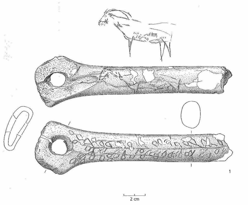 Bâton perforé en bois de renne avec un décor gravé (bouquetin sur une face, branche feuillée sur l’autre). L.I. Stahl Gretsch, Les occupations magdaléniennes du Veyrier, Lausanne, 2006