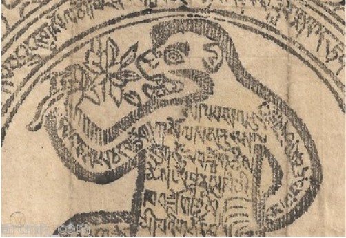 Pièce de mandala rituel, 19ème siècle, impression en bloc de bois sur papier de riz en langue tibétaine. C’est le mi teh qui apparaît dans les ornements des temples bouddhiques, les rouleaux peints de thangka religieux et les histoires traditionnelles..
