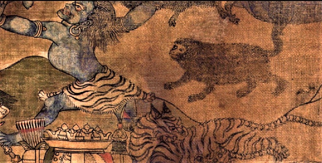 Offrandes courroucées ( tibétain : kang dze ), une peinture sur coton du XIXe siècle, représentant un éventail de divers symboles effrayants représentant des êtres et des objets pouvant être offerts aux divinités. Au milieu des animaux sauvages, un couple de mi-go. Ces types de peintures étaient généralement accrochées dans les plus petits temples protecteurs