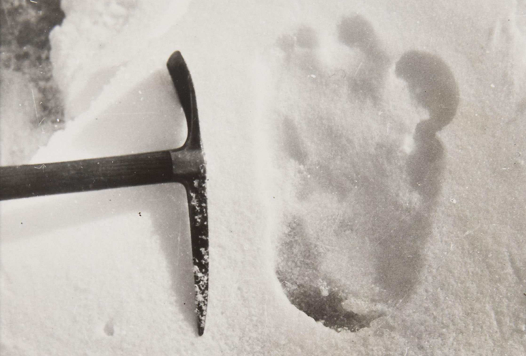Sans être encordés, mais proches les uns des autres, nous avons descendu les pentes larges, faciles et douces du glacier qui se terminaient dans le Menlung Chu jusqu’à ce que, dans une zone presque plate à environ 15-16 000 pieds (5000mètres), nous rencontrions toute une série d’empreintes de pas dans la neige. Celles-ci semblaient être de deux variétés, l’une plutôt indistincte menant aux champs de neige environnants, tandis que l’autre avait par endroits une empreinte nettement individuelle gravée dans la couche de neige de deux à quatre pouces (8cm) au sommet du névé durci. Nous n’avions aucun moyen de les mesurer, alors Shipton a pris quatre photographies, deux des empreintes indistinctes avec moi-même, mes empreintes de pas et mon sac à dos à titre de comparaison; les deux autres photos étaient de l’une des empreintes les plus distinctes et détaillées, une avec mon piolet et une avec mon pied botté pour l’échelle. Cette empreinte était à peu près de la même longueur que ma botte, une taille continentale 42 (8’/2 britannique), qui mesure environ 12 à 13 pouces de long(30cm).