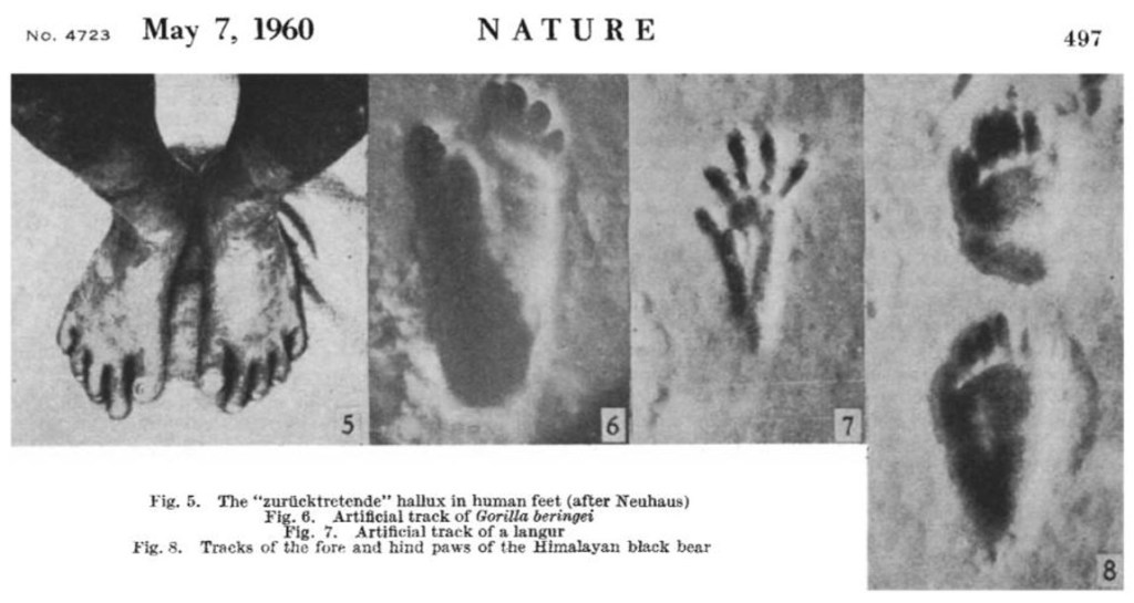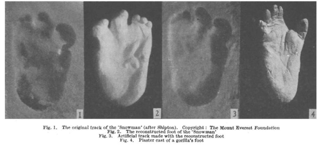 Eric Shipton a pris quatre photographies. Deux montraient une ligne de pistes s’étendant à travers la neige, une avec Michael Ward debout à côté d’eux. Deux étaient des gros plans, d’une seule empreinte de pas, qui avait un gros orteil proéminent et des impressions de peut-être quatre orteils voisins. Pour indiquer la taille des empreintes, estimées à environ 12 pouces par 6, ( 30cm par 15cm) Shipton a inclus un piolet dans l’un des photographies et la botte de Ward dans l’autre.