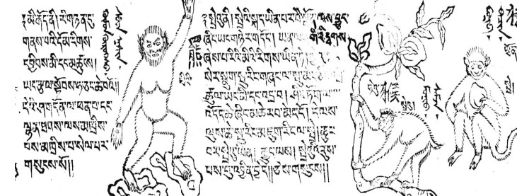 Le peuple tibétain est né sur l’une de ces montagnes bordant la vallée du Yarlung. Cette montagne était habitée par sinmo, une ogresse des rochers, qui était une incarnation de la divinité bouddhiste de la miséricorde, Drolma. L’ogresse a rencontré un singe, qui était une incarnation de la divinité bouddhiste de la compassion Chenrezig , et les deux se sont accouplés. Ils ont produit six enfants hybrides singe-humain qui sont devenus les ancêtres des six clans tibétains d’origine. Les humains-singes étaient petits et couverts de poils, se tenaient droits et avaient peut-être des queues. Au fil des générations, la progéniture des six ancêtres du clan a évolué, devenant moins simienne et plus humaine, jusqu’à ce qu’ils deviennent le peuple tibétain. Selon la tradition orale tibétaine, cependant, certains de ces premiers ancêtres n’ont pas évolué pleinement en humains et sont restés hirsutes : il s’agit du peuple sauvage (mi-go), ou yétis. Dans cette histoire, les yétis et les humains partagent une ascendance et diffèrent seulement dans le degré d’évolution, de civilisation. Les yétis sont différents des autres animaux non humains, car ils partagent une parenté ancestrale avec les humains, mais ils ne sont pas pleinement humains.