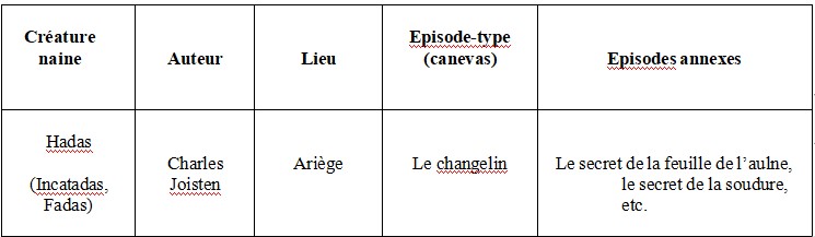 « Une paysanne qui habitait dans la montagne avait un enfant malade qu’elle donna à soigner à une encantada. Mais, lorsque l’enfant fut guéri, les parents s’aperçurent que l’encantada avait substitué son propre enfant tout poilu au leur qui allait mourir, afin que le sien prospère » (Version 1, Saurat, 1954). « Une fada vola, un jour, un enfant de Suc ; en retour, sa mère lui prit un petit fadoet. La fée lui dit : « Rends-moi le mien, je te rendrai le tien. » Elles reprirent chacun le leur » (Version 2, Vicdessos, hameau de Suc, 1953).