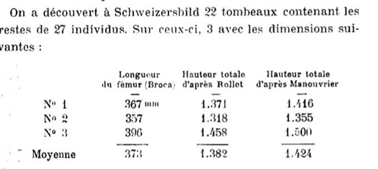 Julius Kollmann, étudiant les trois fémurs les mieux conservés du lot de 1894 comprenant cinq squelettes de petites tailles, en vient à des estimations de tailles très précises pour les petits hommes du Schweizerbild, qui oscillaient tous les trois entre 1,35 et 1,50 mètres, en fonction de la méthode d’Etienne Rollet ou de Léonce Manouvrier.