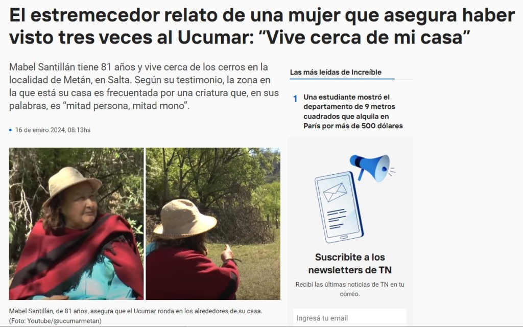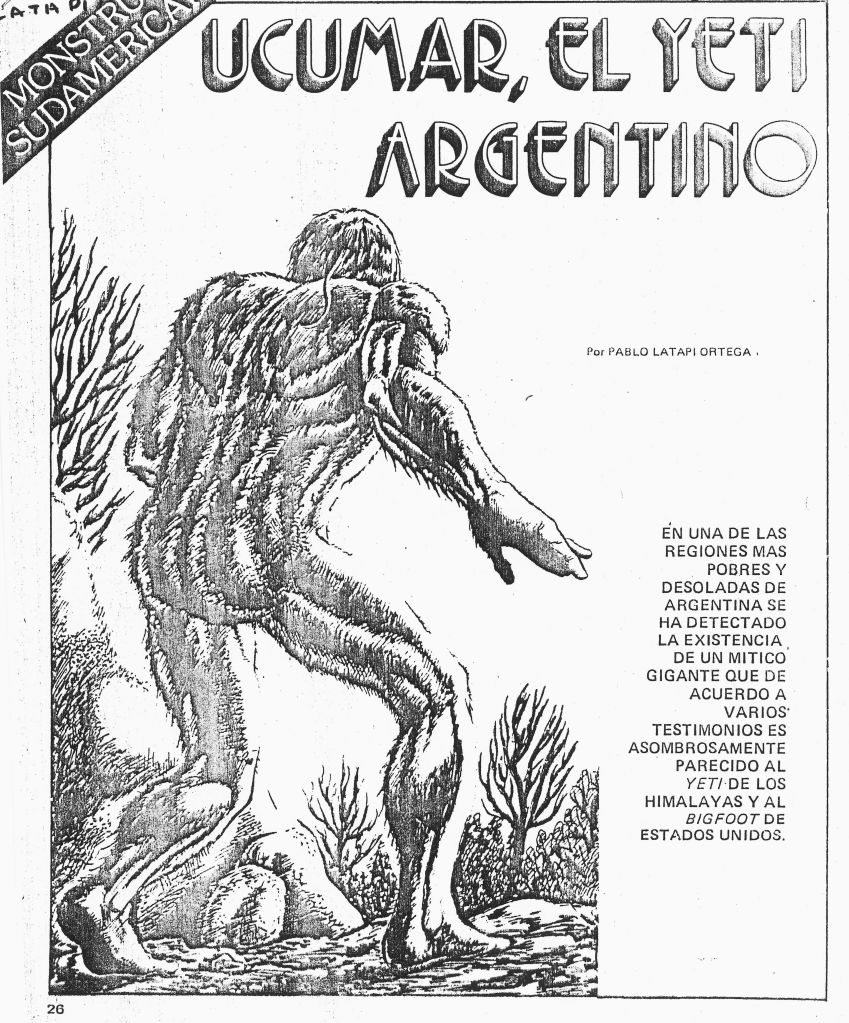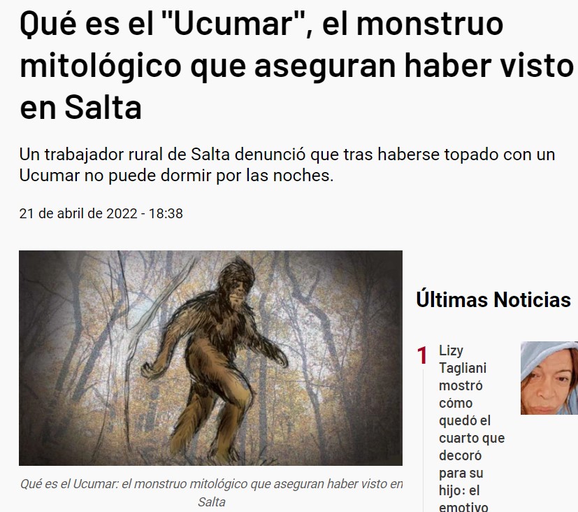 Les gauchos et les aborigènes de cette municipalité entourée par le massif montagneux Chaco de Salta, à 450 kilomètres au nord-est de la capitale provinciale, dans le département de Rivadavia, sont stupéfaits et demandent l’aide des autorités : depuis trois mois, les marchands de la région sont effrayés, car un être étrange et poilu, d’apparence humanoïde, qui se déplace sur deux jambes et mesure environ 1,70 mètre, rôde autour de leurs étals. « C’est L’Ucumar », disent-ils ( plus de détails ici).