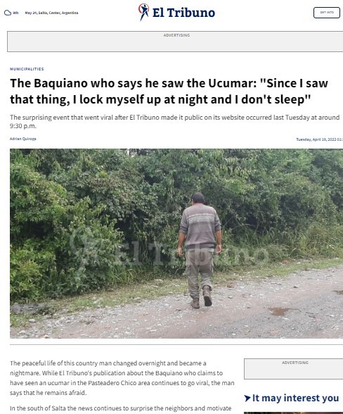 « Pour sa part, le sergent ( municipal) Ricardo Alzogaray, né dans ces forêts et dont les proches sont les principaux témoins des apparitions de l’humanoïde, a déclaré : « La véracité des récits et le sérieux de ces personnes ne sont pas en cause. Nous avons été appelés par des familles qui n’ont jamais porté plainte, et des gauchos et des criollas qui ne perdent pas de temps avec des blagues. Les femmes aborigènes qui prétendent l’avoir vu sont des voisines respectables de la côte. C’est pourquoi nous sommes allés inspecter. Malheureusement, l’épaisseur de la montagne l’emporta. Du personnel approprié devrait venir aider à capturer cette créature, qui souffre sûrement et que nous ne voulons en aucun cas tuer », tandis que ses collègues du Chaco de Salta acquiesçaient.