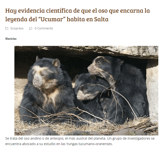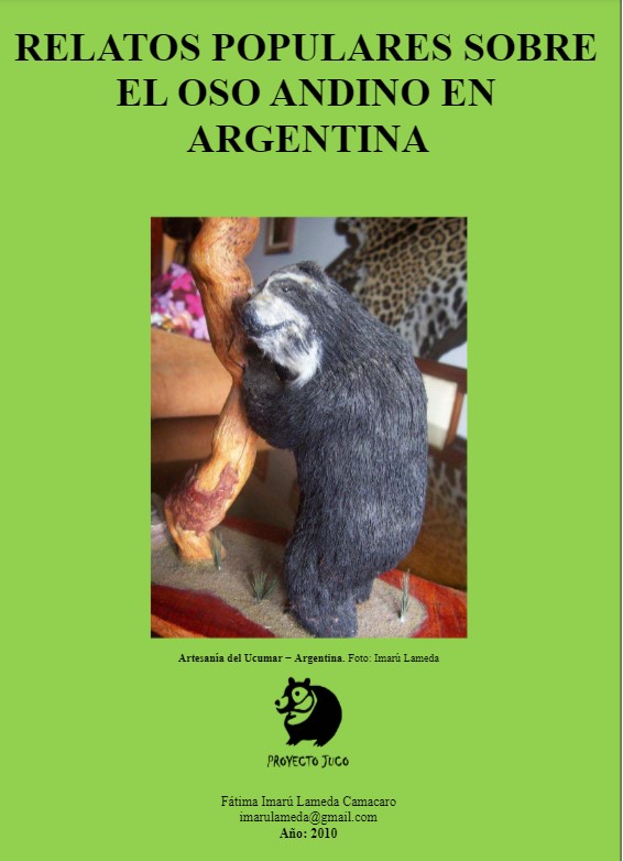 Observations : Lors de visites de terrain dans la jungle du nord-ouest de l’Argentine (Salta et Jujuy) et d’échanges avec des gauchos en cours de route, lors de nos arrêts dans leurs ranchs et des conversations entre les deux que nous avons partagées avec du maté (boisson argentine) et des feuilles de coca, nous avons découvert qu’il existe un personnage aux nombreux noms, qu’ils appellent Juco, uco (a), ucumar (i), panda créole et cela a éveillé en nous le souci d’en savoir plus sur cet animal mi-homme mi-ours dont les gauchos disent qu’il sort dans la jungle ; notre surprise est que cet animal dont ils parlent tant et qui est même un mystère est notre charismatique ours andin (Tremarctos ornatus).