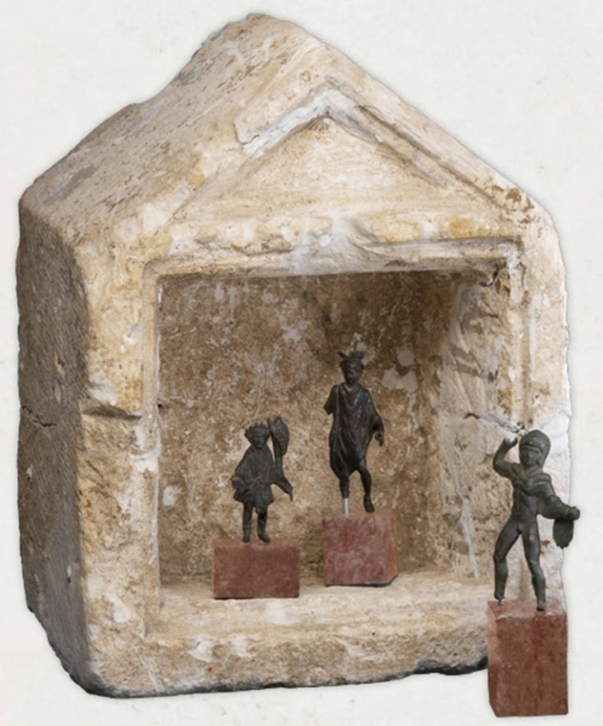 Les dieux lares étaient les dieux du quotidien qui protégeaient toute la famille du mauvais sort. On les fêtait autour du solstice d’hiver. Ils étaient de petits hommes, jeunes, vêtus de peaux de chiens selon Plutarque. Les lares domestiques protégeaient les habitants de la maisonnée tandis que les lares ruraux étaient les gardiens vigilants des champs de blés.