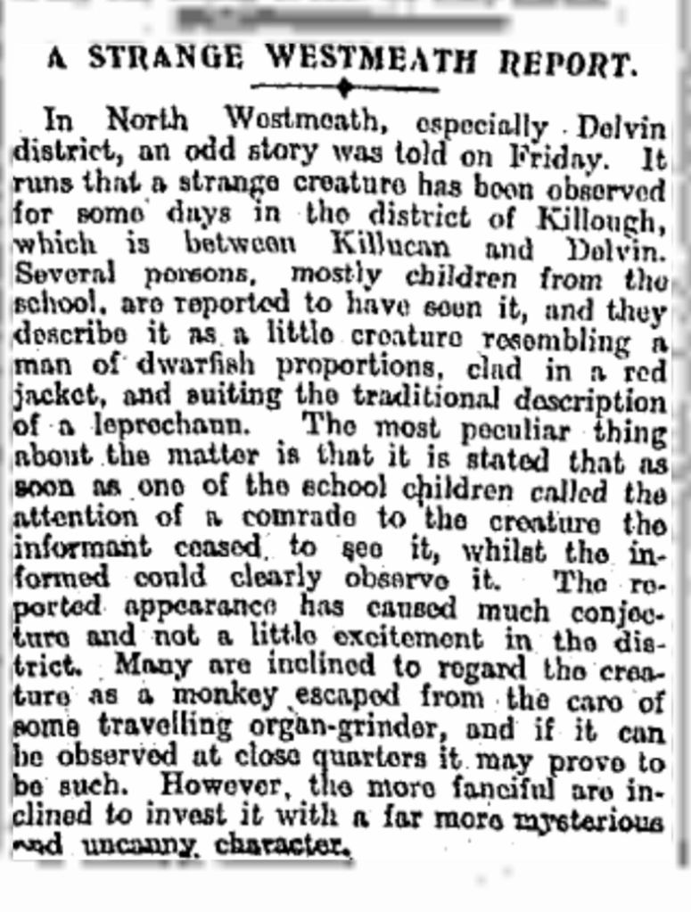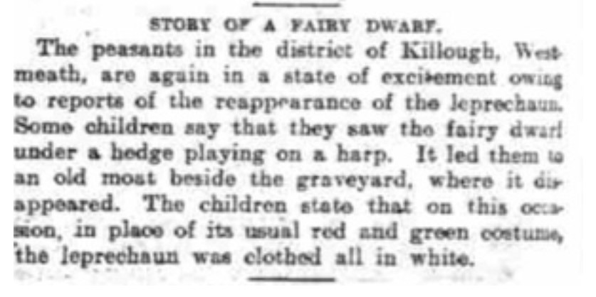C’est arrivé en 1908, à Killough, dans le comté de Westmeath. Des écoliers ont affirmé apercevoir à plusieurs reprises, des êtres minuscules habillés en rouge, coiffés de curieux chapeaux, décrits exactement comme des Leprechaun. Les adultes, se sont engouffré dans cette histoire, sans qu’aucun des parents d’élèves, ou de leurs professeurs n’ait pu corroborer ces témoignages. Mais qu’importe, il y avait une chance de capturer un Leprechaun et de profiter de son trésor !