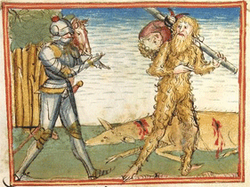 Boris Porchnev imaginait alors que l’homme médiéval au côté de l’homme sauvage était « un monstreur », un troubadour qui exhibait cet homme sauvage en circulant de foire en foire. L’homme sauvage ainsi humilié sera vite concurrencé sur le terrain de l’exhibition animale par le singe magot, venu de la lointaine Barbarie (Sud de l’Espagne, Maroc), qui deviendra l’animal fétiche des montreurs et troubadours, et évidemment l’ours, qui remplacera le singe magot au XIXème siècle dans toutes les Pyrénées françaises.