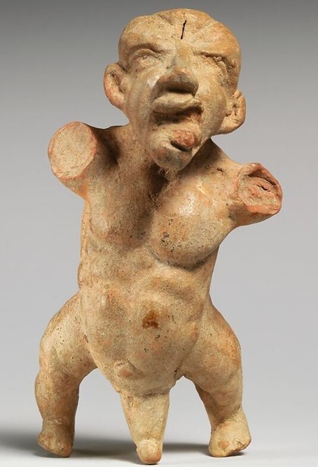 Notre petit homme de bronze souffre d’un nanisme achondroplase caractérisé par une tête disproportionnée par rapport à la hauteur de son corps. Les signes spécifiques de cette maladie sont une dolichocéphalie accentuée par un front très bombé, une forte saillie occipitale, et des membres courts. Son visage est celui d’un homme d’âge mûr, fatigué et quelque peu terne, mais d’un réalisme touchant. Les yeux enfoncés, soulignés de poches, trahissent la fatigue et l’angoisse.