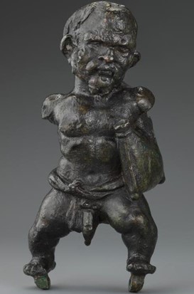 La Rome antique, suivant le modèle grec, dédoublera aussi la figure du petit peuple : soit en pygmaeus, soit en nanus. La vision du pygmaeus se rapproche de celle étudiée durant l’Egypte antique, à savoir l’authentique pygmée centrafricain. Mais n’étant pas comme l’Egypte ancré sur le continent africain, l’Italie démontre une certaine distance à l’égard du pygmaeus qui, méconnu, passe pour avoir une sexualité totalement débridée, à l’image de cette statue d’un pygmée au sexe rétroversé.