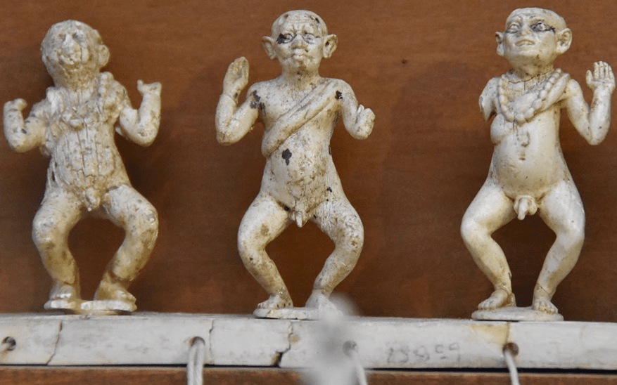 Un pendant plus prosaïque à la représentation divine du dieu Bès se retrouvera à travers les figurations égyptiennes des pygmées. Durant l’Antiquité, les commerçants égyptiens ramenaient sporadiquement des pygmées d’Afrique centrale en cadeau à l’élite égyptienne. Ils étaient surtout appréciés comme danseurs, comme le démontre ce jeu vieux de 4000 ans où un système ingénieux de corde permet à trois figurines en ivoire de tournaient circulairement soit à gauche, soit à droite. Ce peuple africain de petite taille, d’abord connu en Egypte, est ensuite relayé en Europe par les écrits d’Hésiode, d’Homère et de Pline l’Ancien.