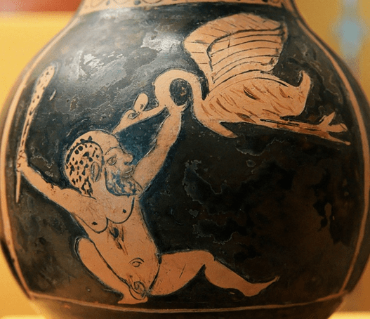 Combat d’un pygmée et de la déesse Gérana, changée en grue (Œnochoé attique à figures rouges, 430-420 av. J.-C. Musée archéologique national à Madrid)