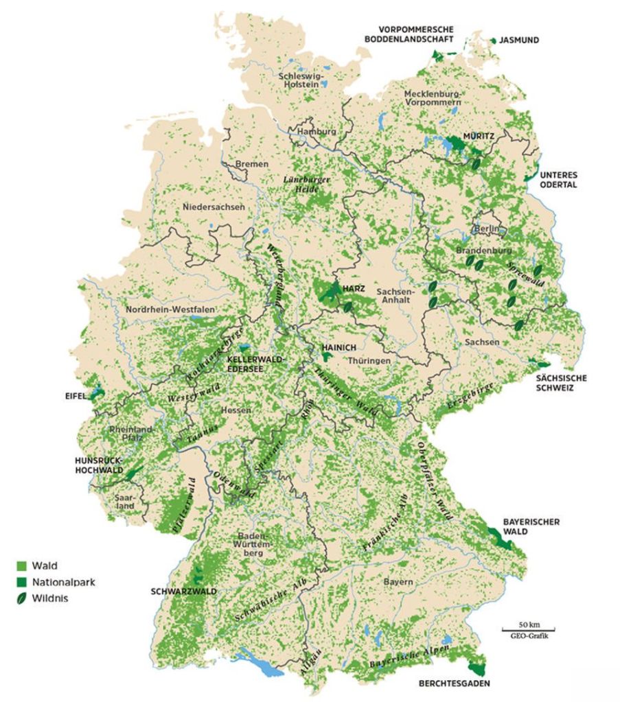 Wilde Mann est plus qu’ailleurs un homme des bois car l’Allemagne est réputée depuis l’antiquité pour ses vastes et impénétrables forêts, décrites notamment par Jules César dans La guerre des Gaules ou Tacite dans Germania. Il s’y cacherait une faune étrange et unique, venue du fond des âges. Les Germains étaient aux yeux des romains des sauvages par excellence, mais investis d’une certaine noblesse, car préservés de ces vices qui auraient corrompu Rome. Ce thème de la forêt comme celui du milieu originel du peuple germanique a ensuite été interprété, instrumentalisé de diverses façon selon les époques, c’est un vaste sujet. Ce lien entre le peuple allemand et ses forêts est depuis longtemps mythique et abstrait car en réalité l’Allemagne a été largement défrichée et aujourd’hui, les espaces boisés n’y sont pas plus importants qu’ailleurs en Europe. ( article sur la symbolique de la forêt germanique).